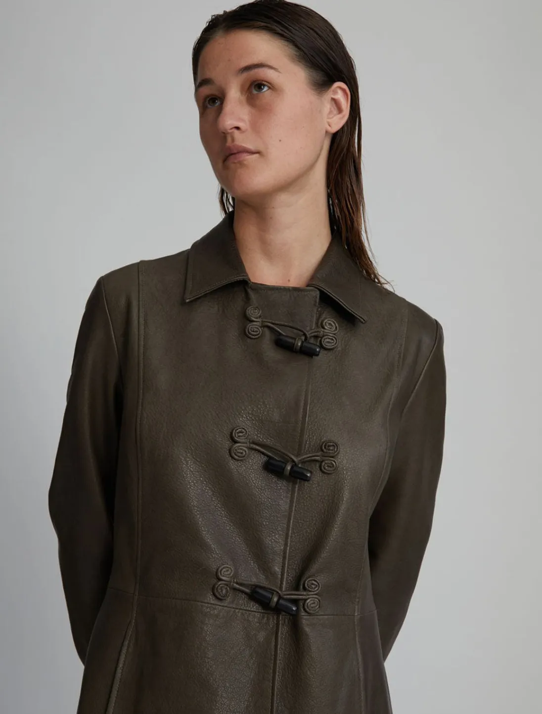 Lang, Blød, Figursyet Læderjakke Med Vippelukning Foran.