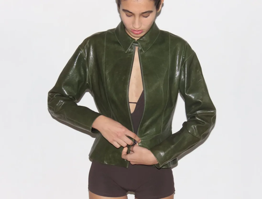 Skræddersyet Slidt Læderjakke I Taljen Med Brede Albueærmer Og Tilpassede Manchetter.