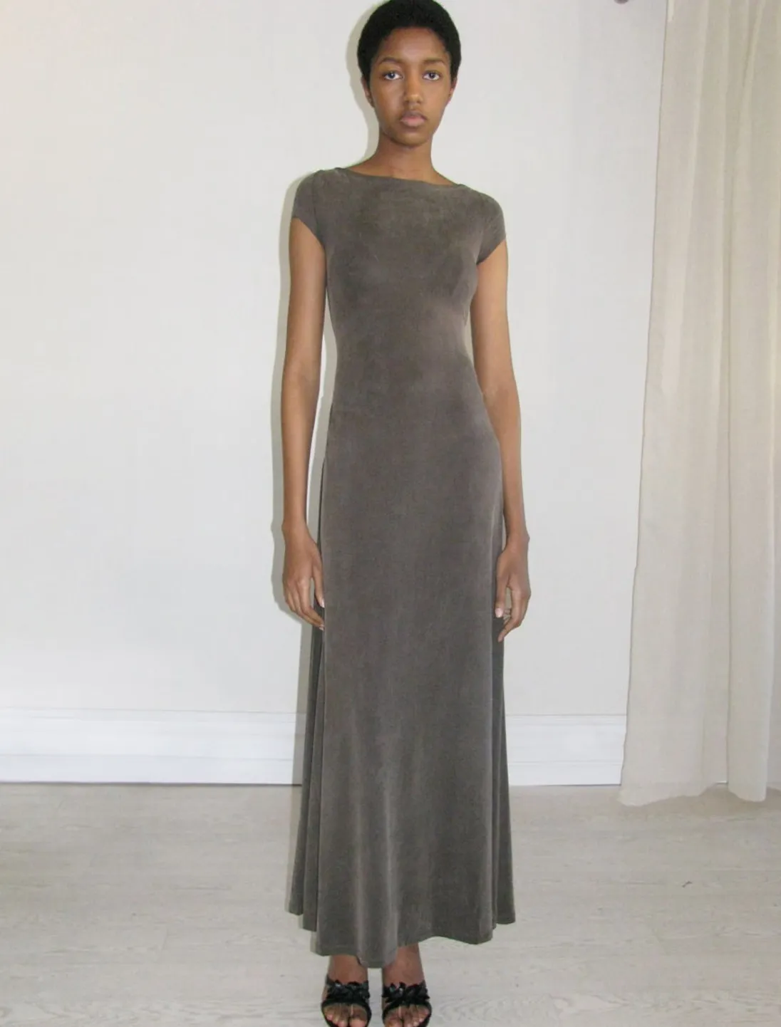 Vendbar Cupro-Kjole Med Åben Ryg Og Draperet Bund.