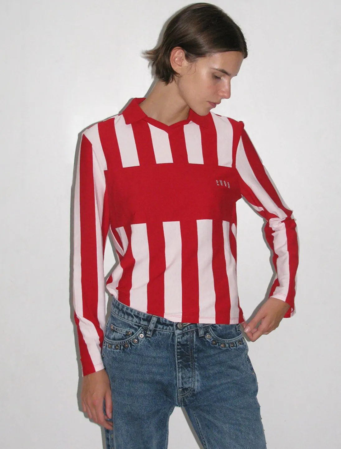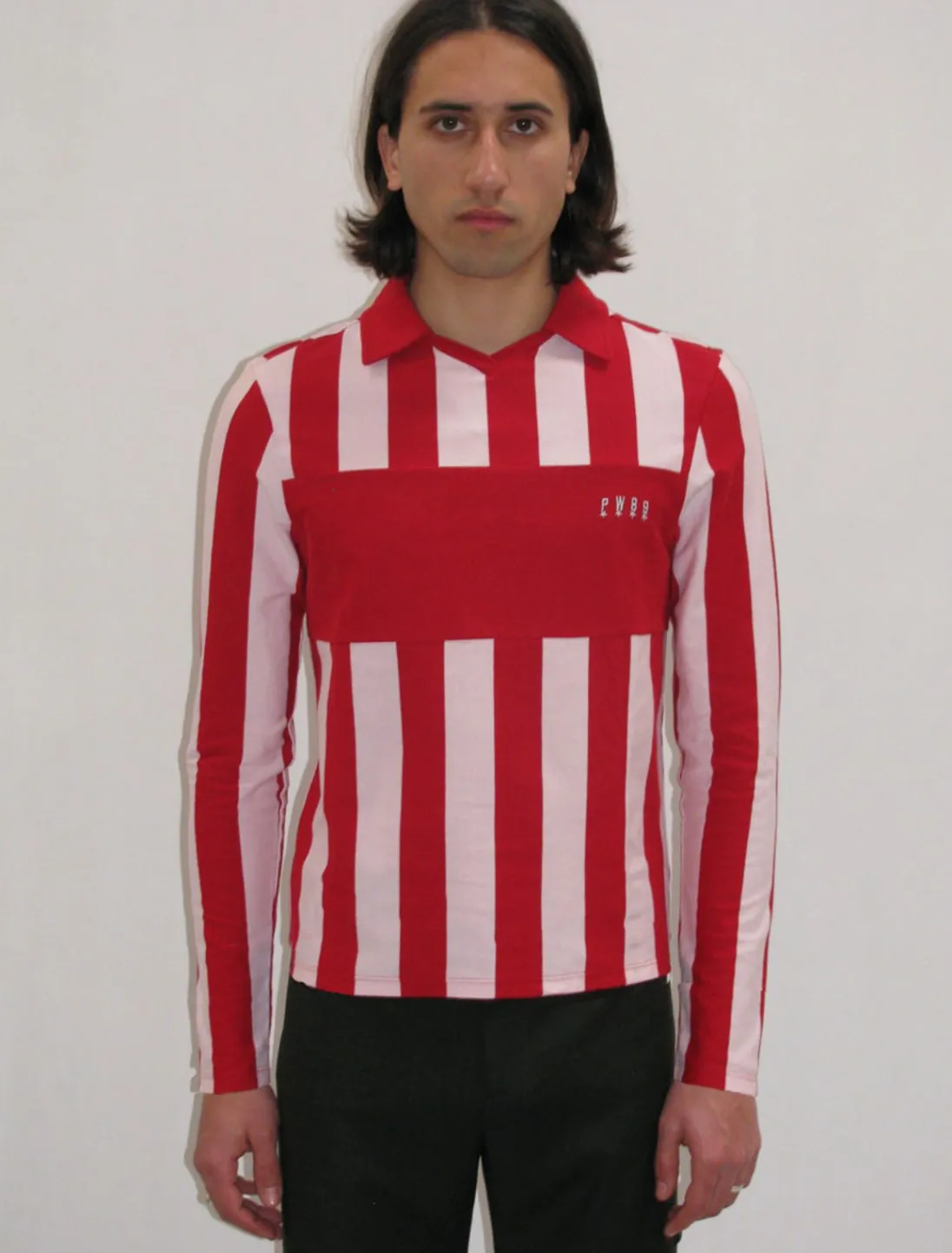 Stribet Sporty Top Med REtro Polo-Hals Og Pw89-Broderi.