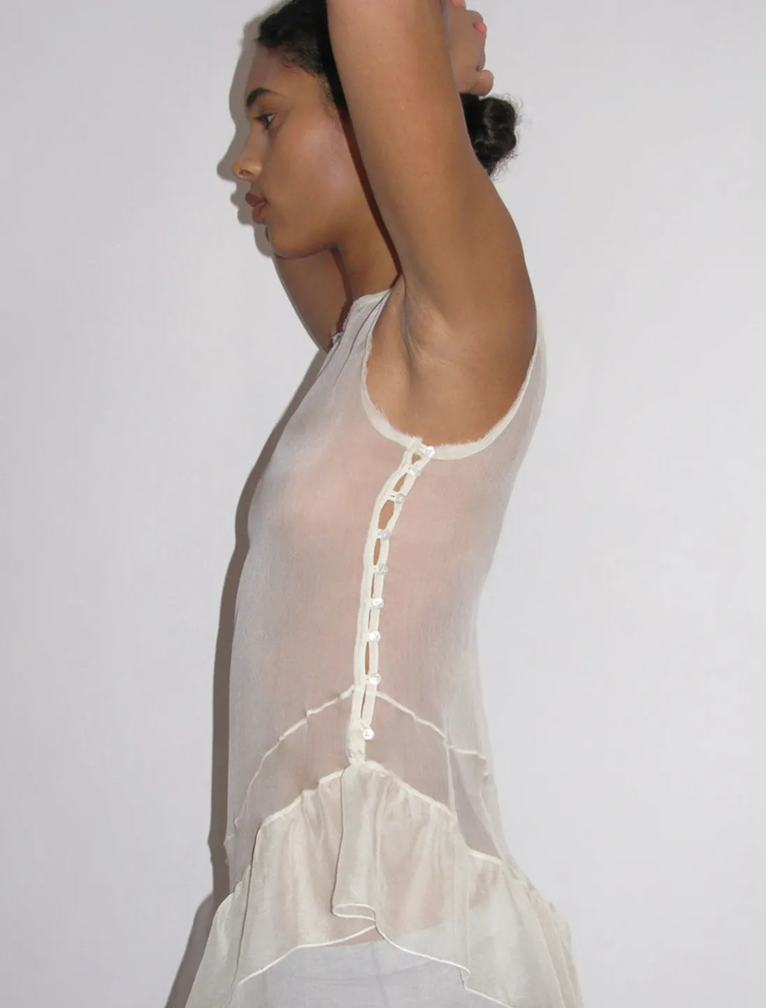 Delikat, Gennemsigtig, Asymmetrisk Bambulakjole I Silke. Side Knap Lukning.