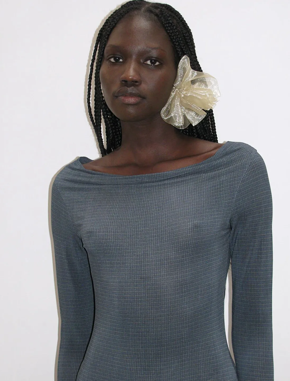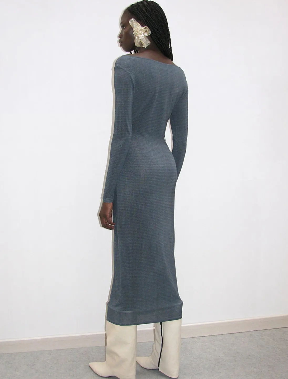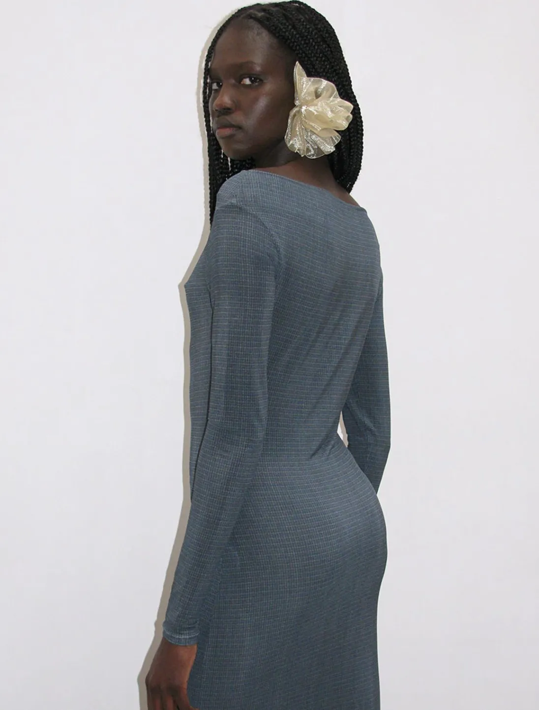 Lys, Delikat, Langærmet Kjole I Ternet Print Med Bådudskæring.