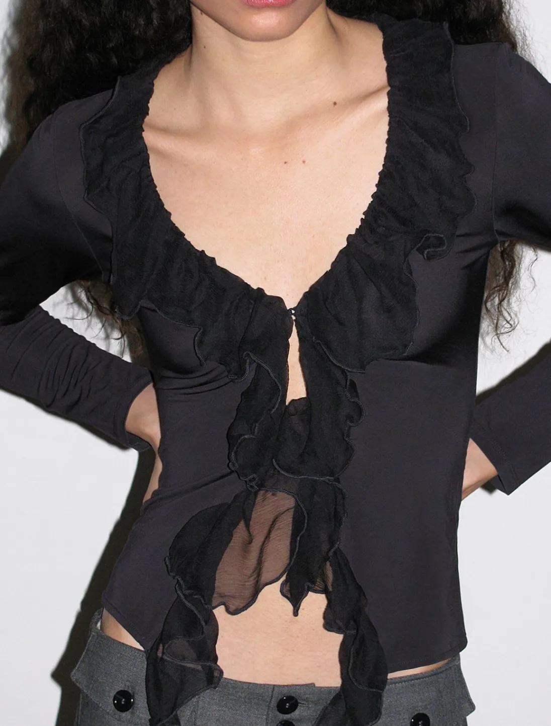 Langt Gennemsigtigt, Langærmet Top, Med Silkeflæser Og Krog- Og Øjenlukning.