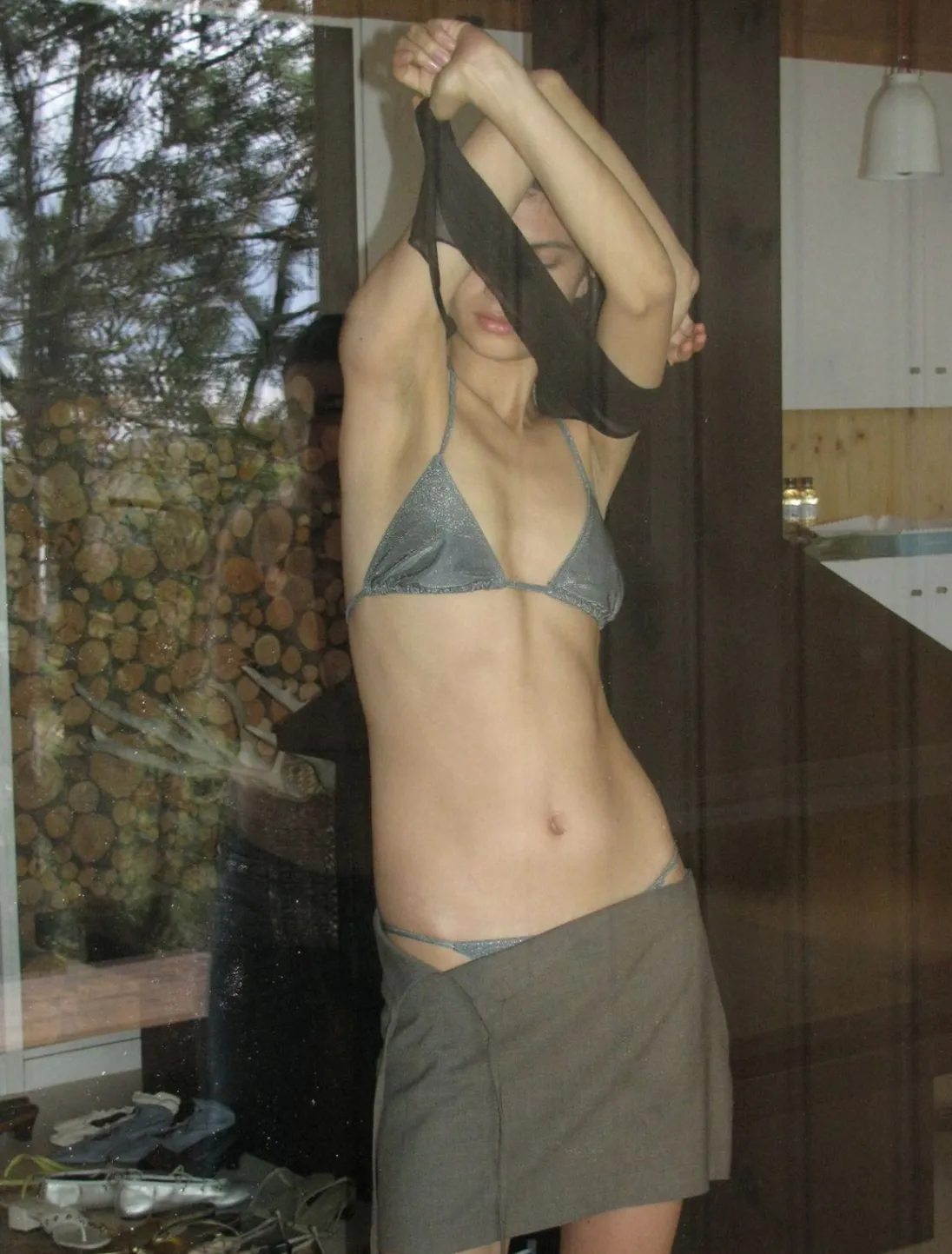 Kort Nederdel Med Foldet Stykke I Linningen Med Snor. Du Kan Bære Den Tabt Eller Binde Den.