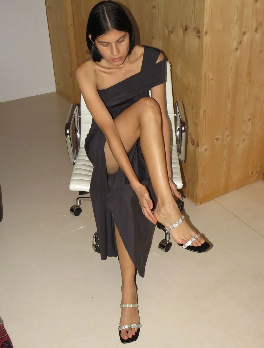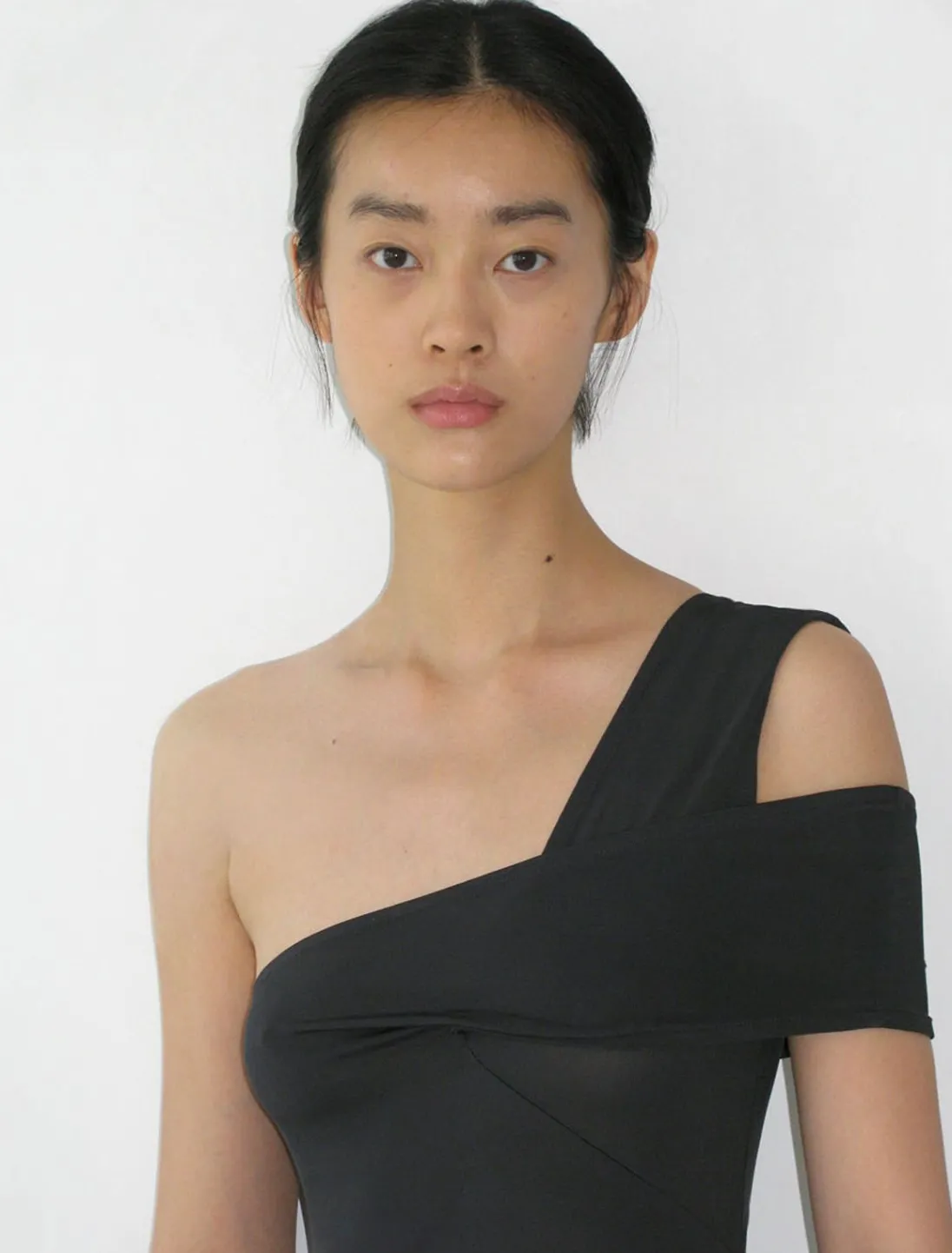 Fastsiddende, Let Gennemsigtig, Asymmetrisk Lang Kjole Med Krydsede Stropper Og Udsving.