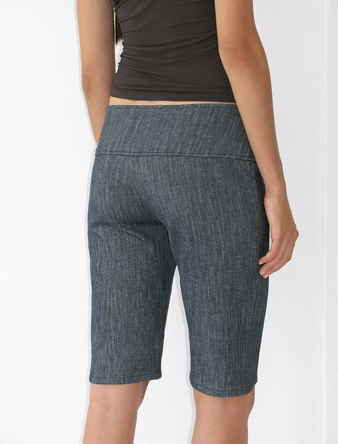 Elastisk Denimeffekt Capri-Bukser Med Bred Linning Og Lav Talje. Fastgøres Med Trykknapper.