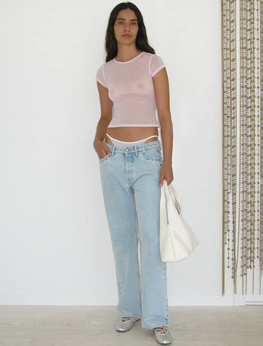 Delikat, Gennemsigtig, Kortærmet Top Med Diamantprint Og Paloma-Uldbroderi.