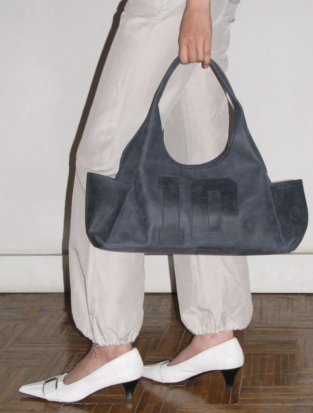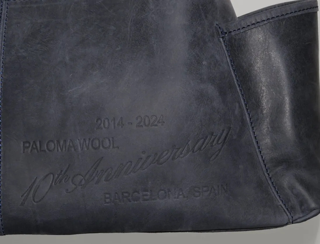 Skuldertaske Med To Lommer, Et ’10 Års’ Lædermærke På Forsiden Og Præget Tekst På Bagsiden.
