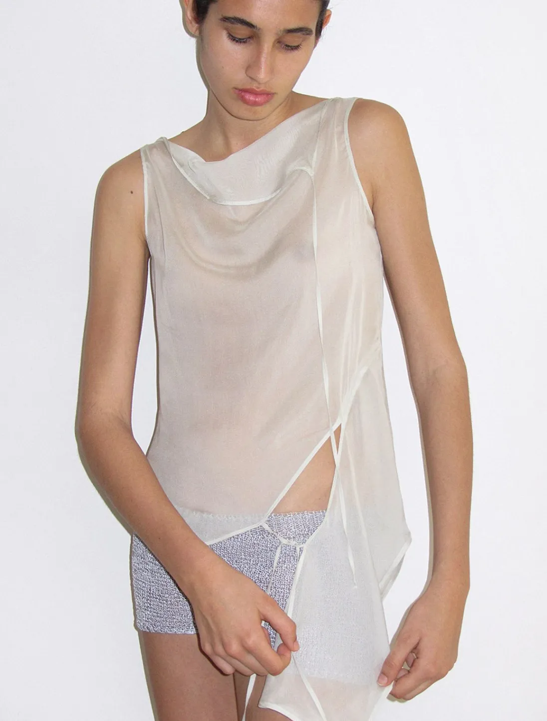 Ærmeløs Asymmetrisk Top Med Et Snit Ved Kant Bånd Af Samme Stof Til At Binde.