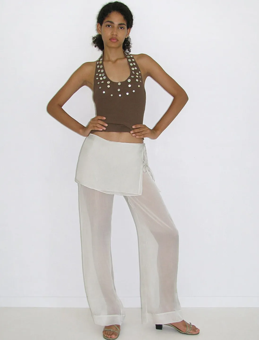 Bukser Med Brede Ben Og Mellemtaljet Med Overlappende Fast Mini-Nederdel (Kan Ikke Tages Af). Mini-Nederdelen Har Flere Lag, Så Den Er Ikke Gennemsigtig.