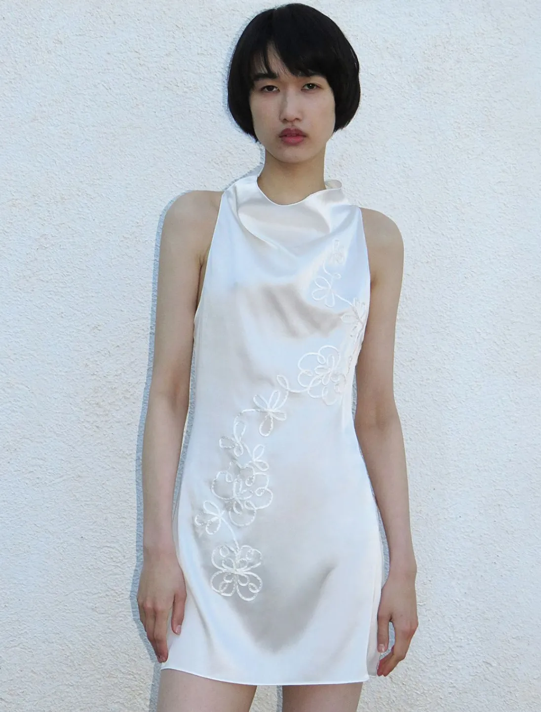 Lidt Gennemsigtig, Delikat Silkekjole Med Draperet Halsudskæring. Den Har Broderi Foran Med Blomstermønstret Bånd. Den Fastgøres Med Sideknapper.