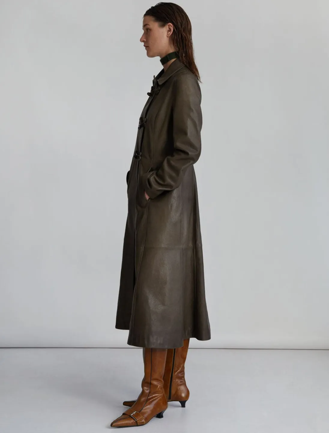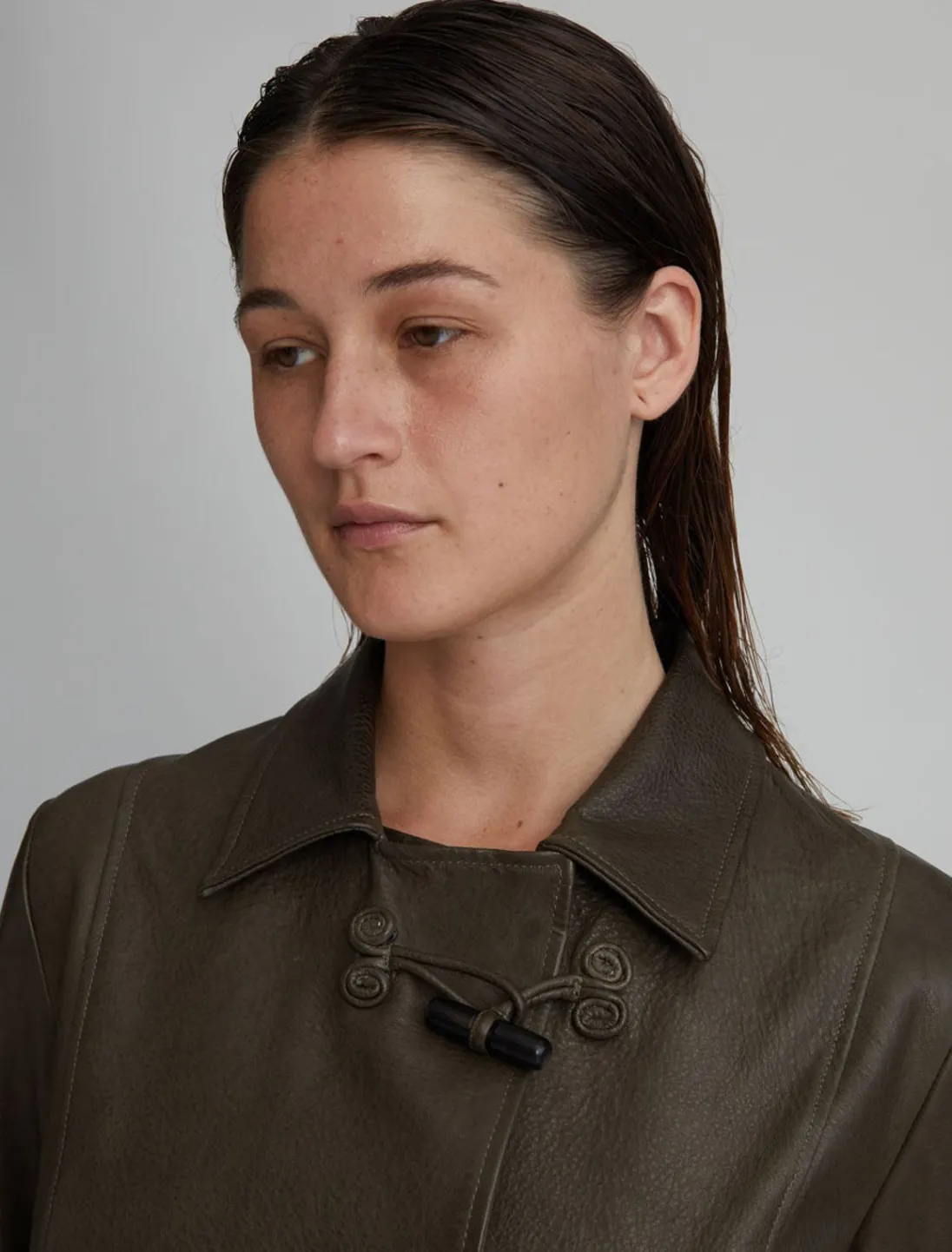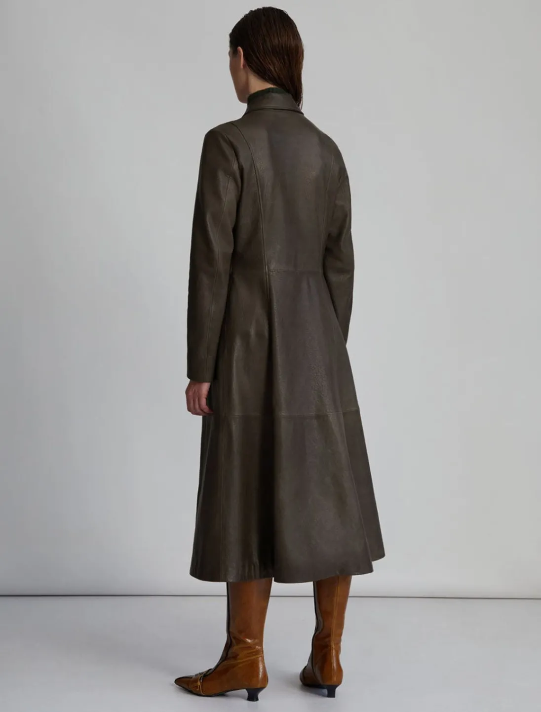 Lang, Blød, Figursyet Læderjakke Med Vippelukning Foran.