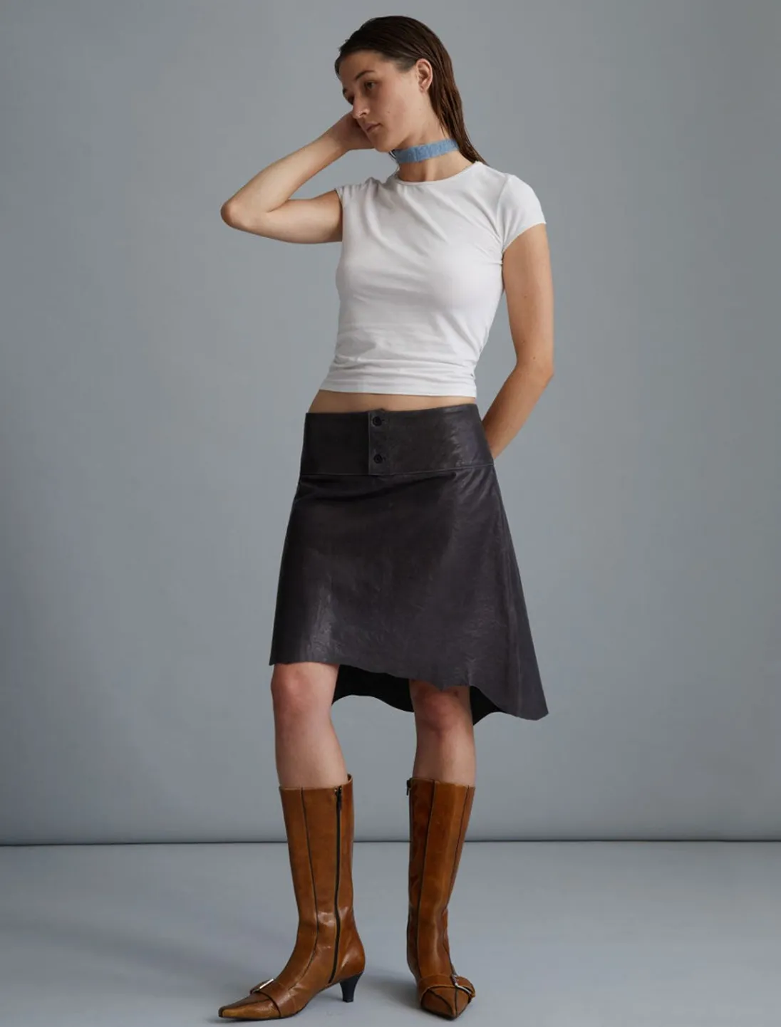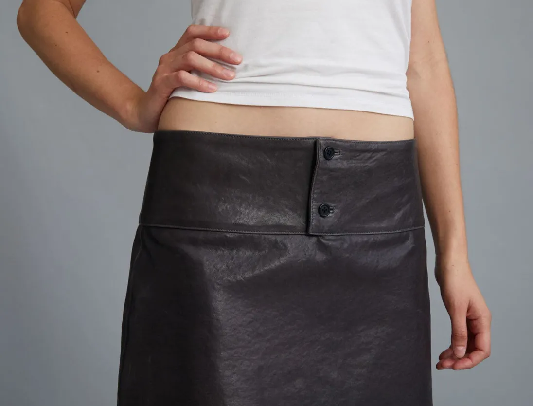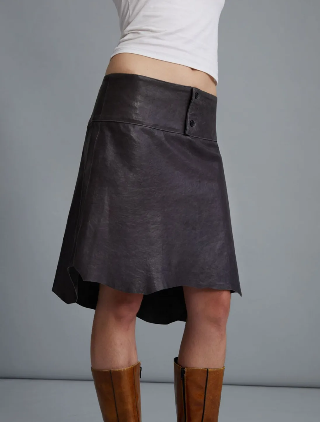 Skræddersyet, Slidt Lædernederdel Med Lavt Talje Med En Asymmetrisk Bund.
