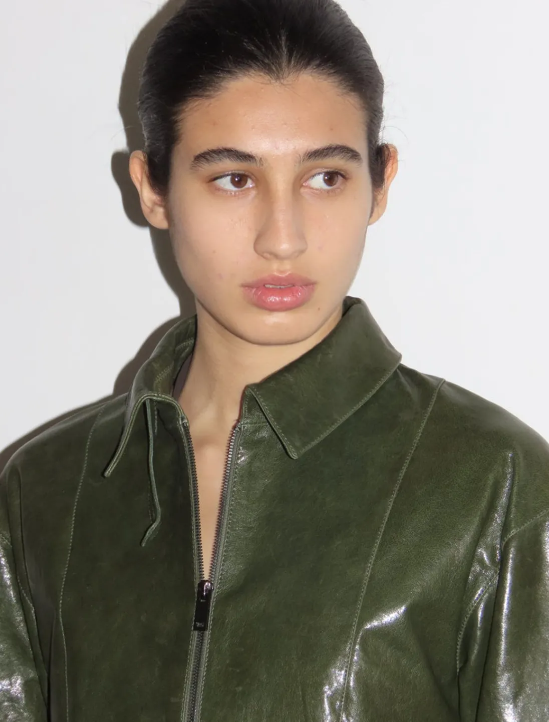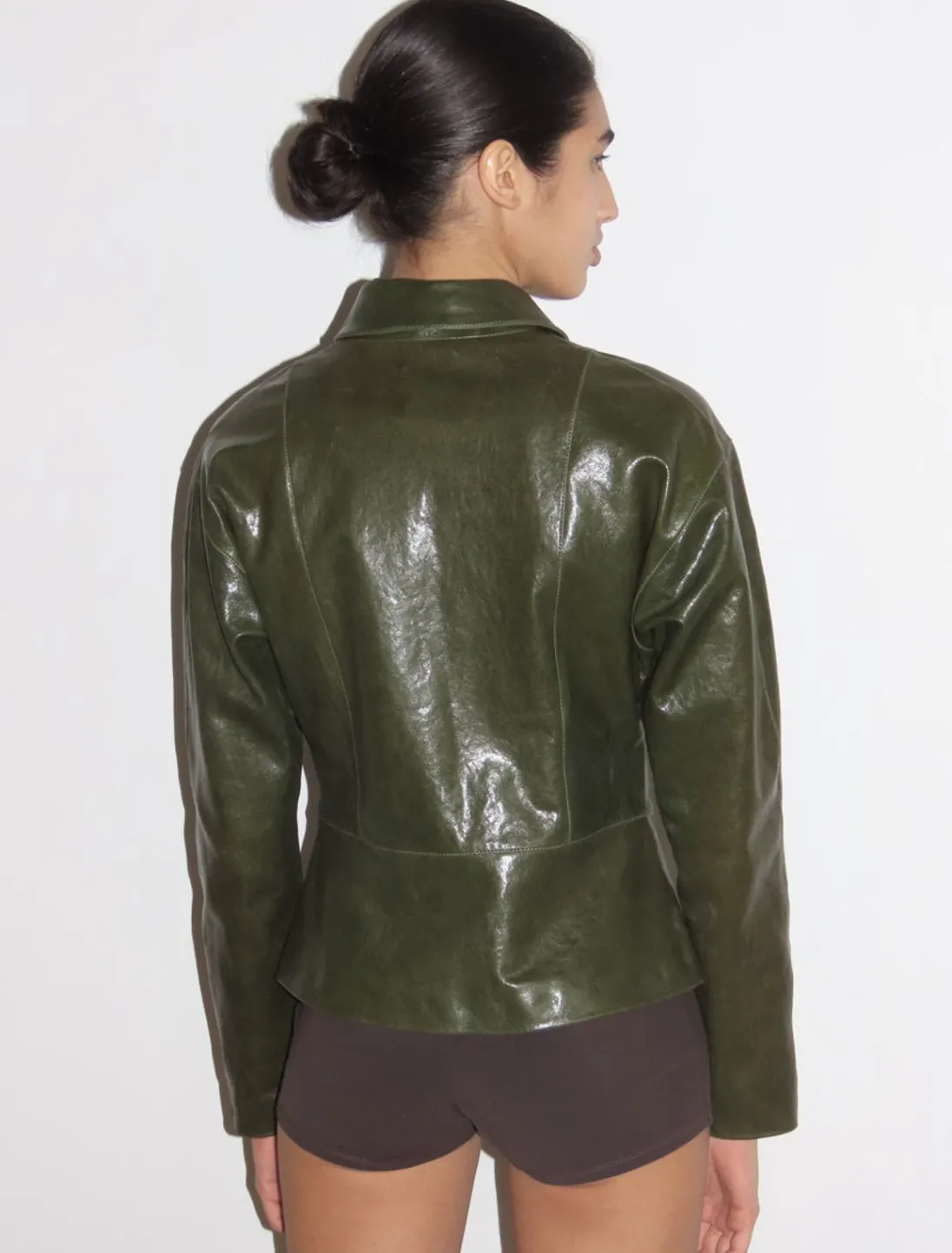Skræddersyet Slidt Læderjakke I Taljen Med Brede Albueærmer Og Tilpassede Manchetter.