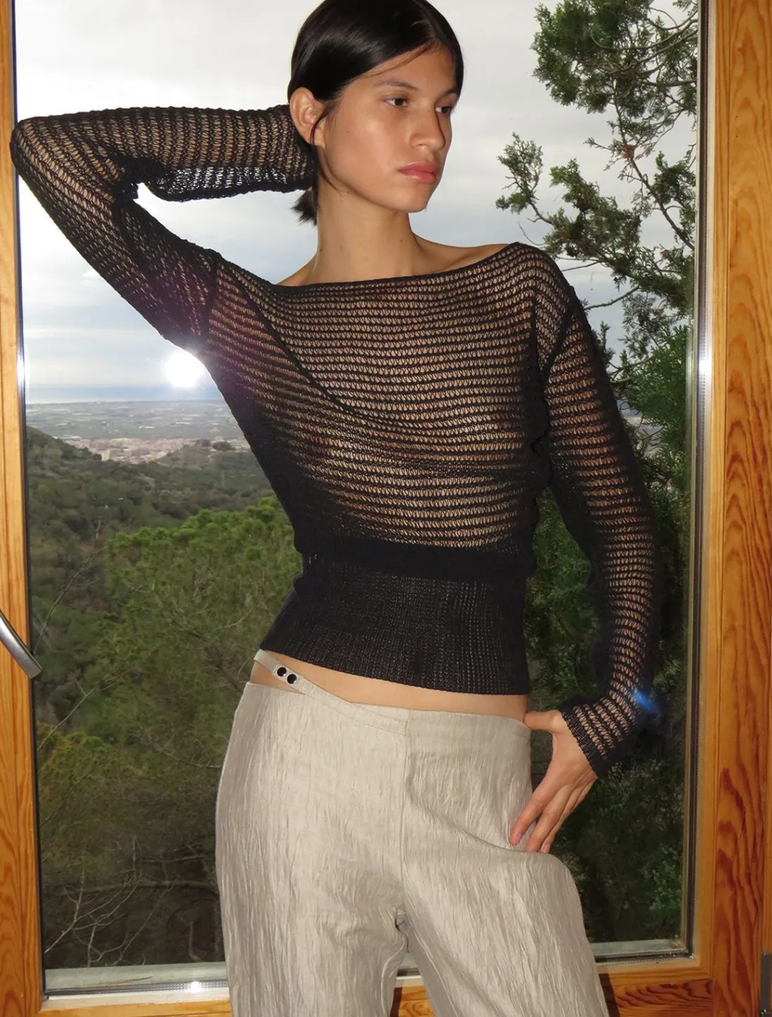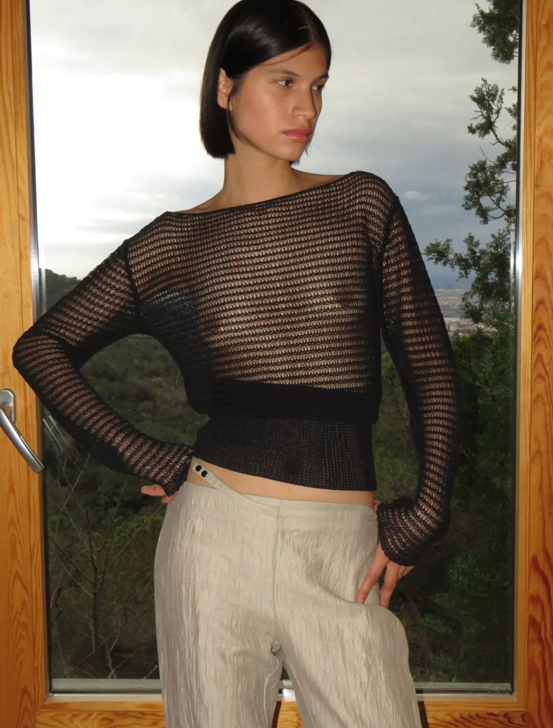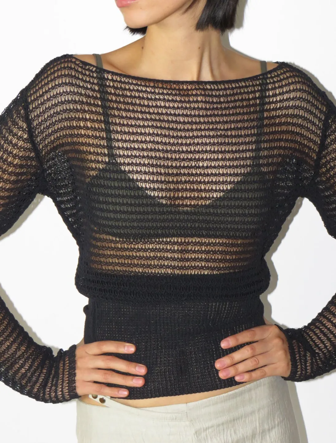 Langærmet, Strikket Top I Ledningstil. Bred Linning I Tætsiddende Ribkant.