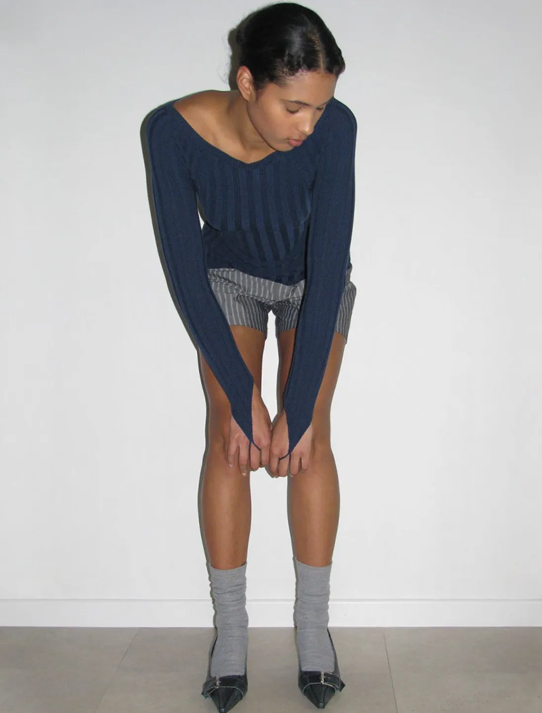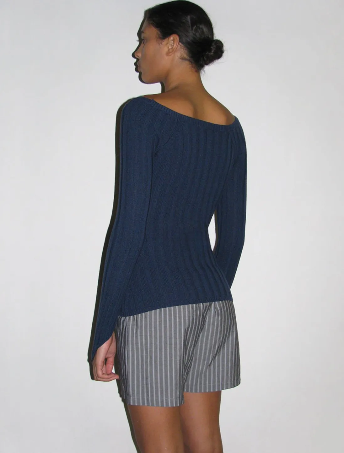 Ribbet Strikket Top Lavet Af Blødt Garn, Med Båd Halsudskæring Og Fingerløkkedetalje På Manchetter.