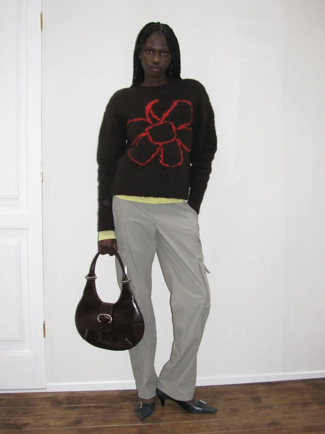 Blød Striktrøje Med Blomsterintarsia Foran.