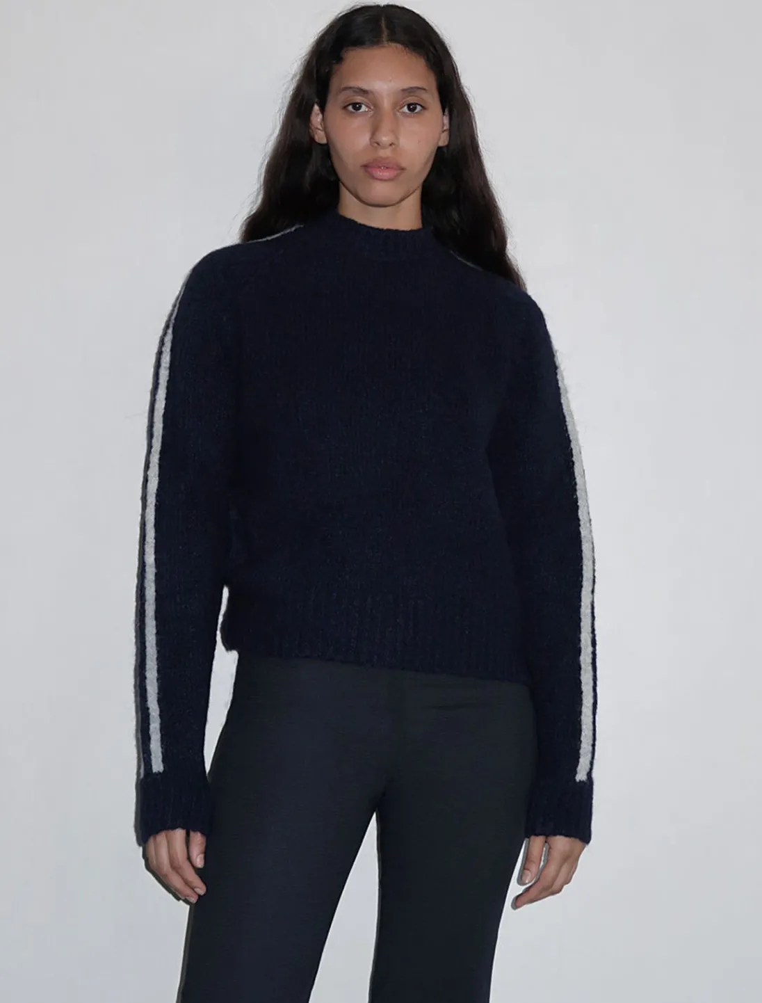 Blød Striktrøje Med Sports-Løbesømme På Ærmer.