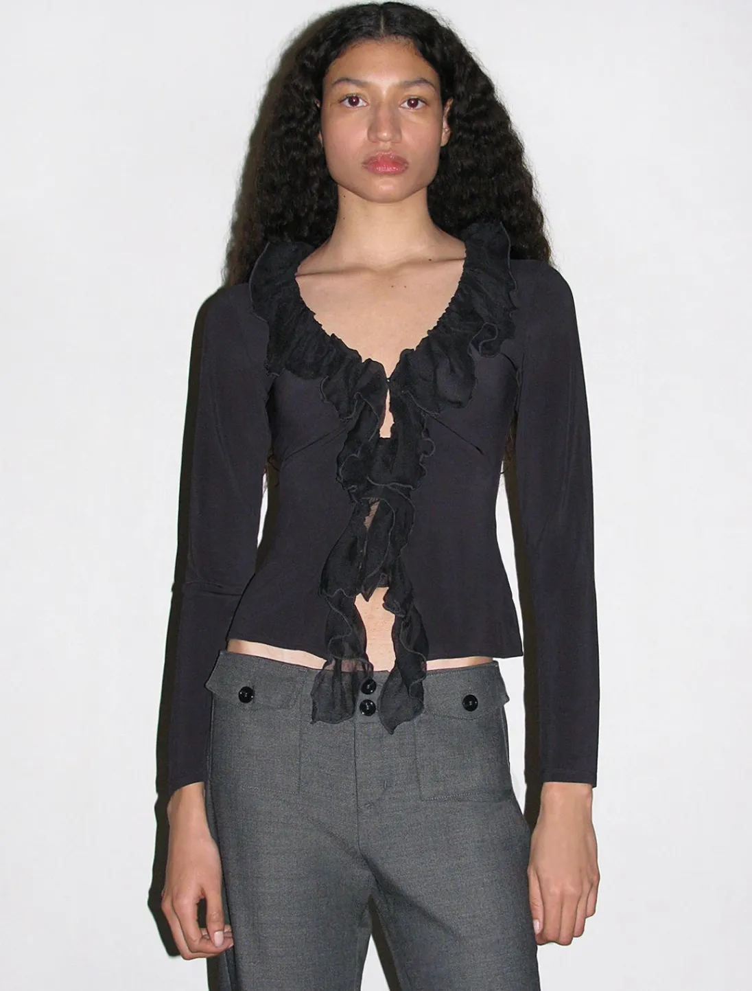 Langt Gennemsigtigt, Langærmet Top, Med Silkeflæser Og Krog- Og Øjenlukning.