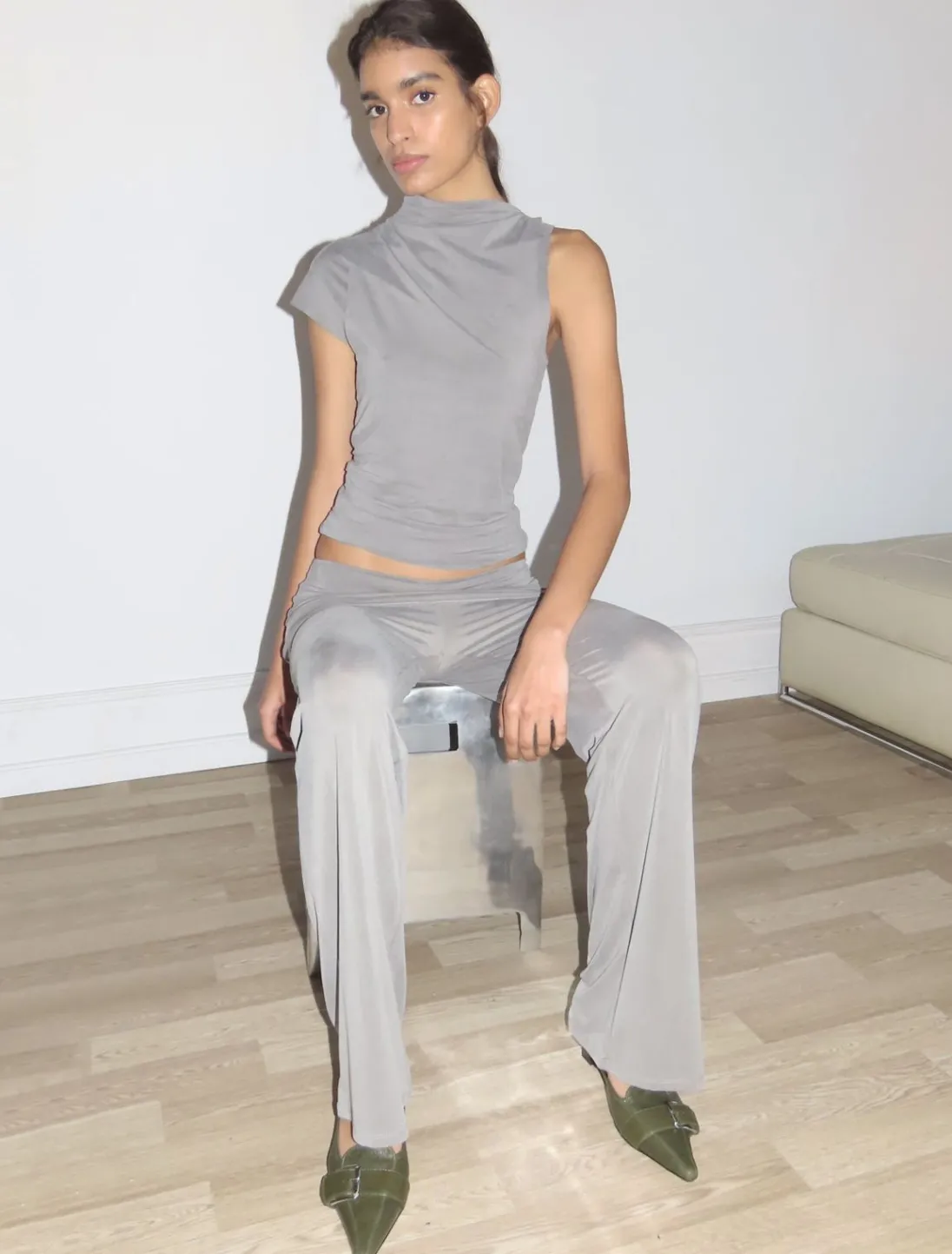 Rygløs Pumpe Med Spids Tå Med 4 Cm Hæl. Den Har En Læderrem Med Et Dekorativt Spænde.