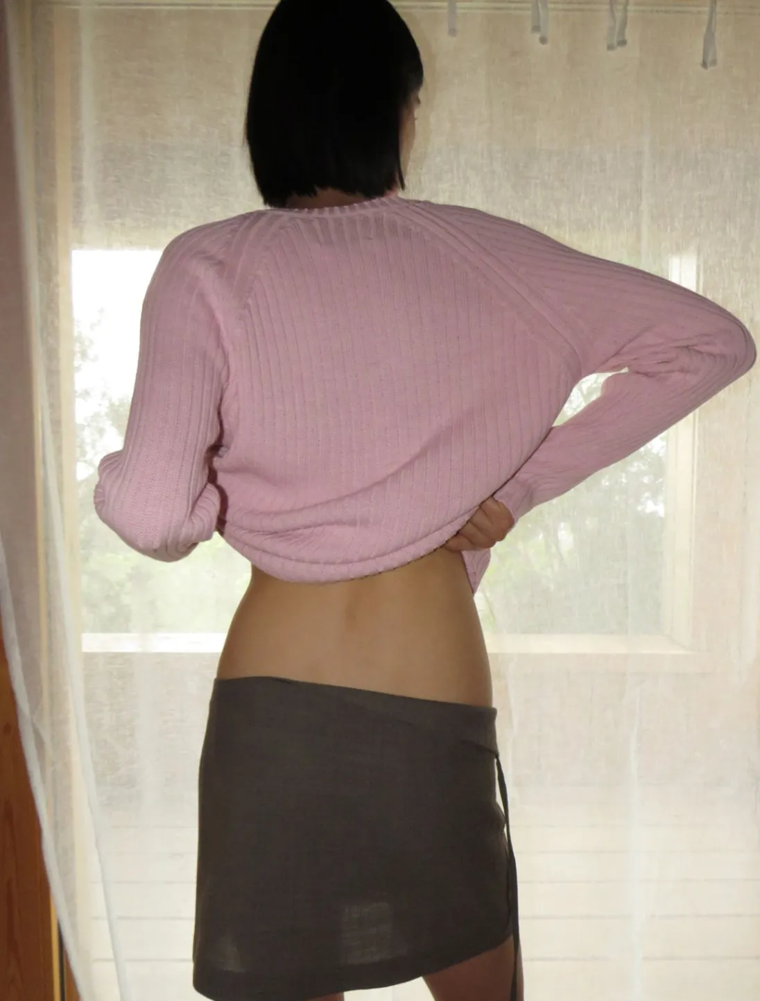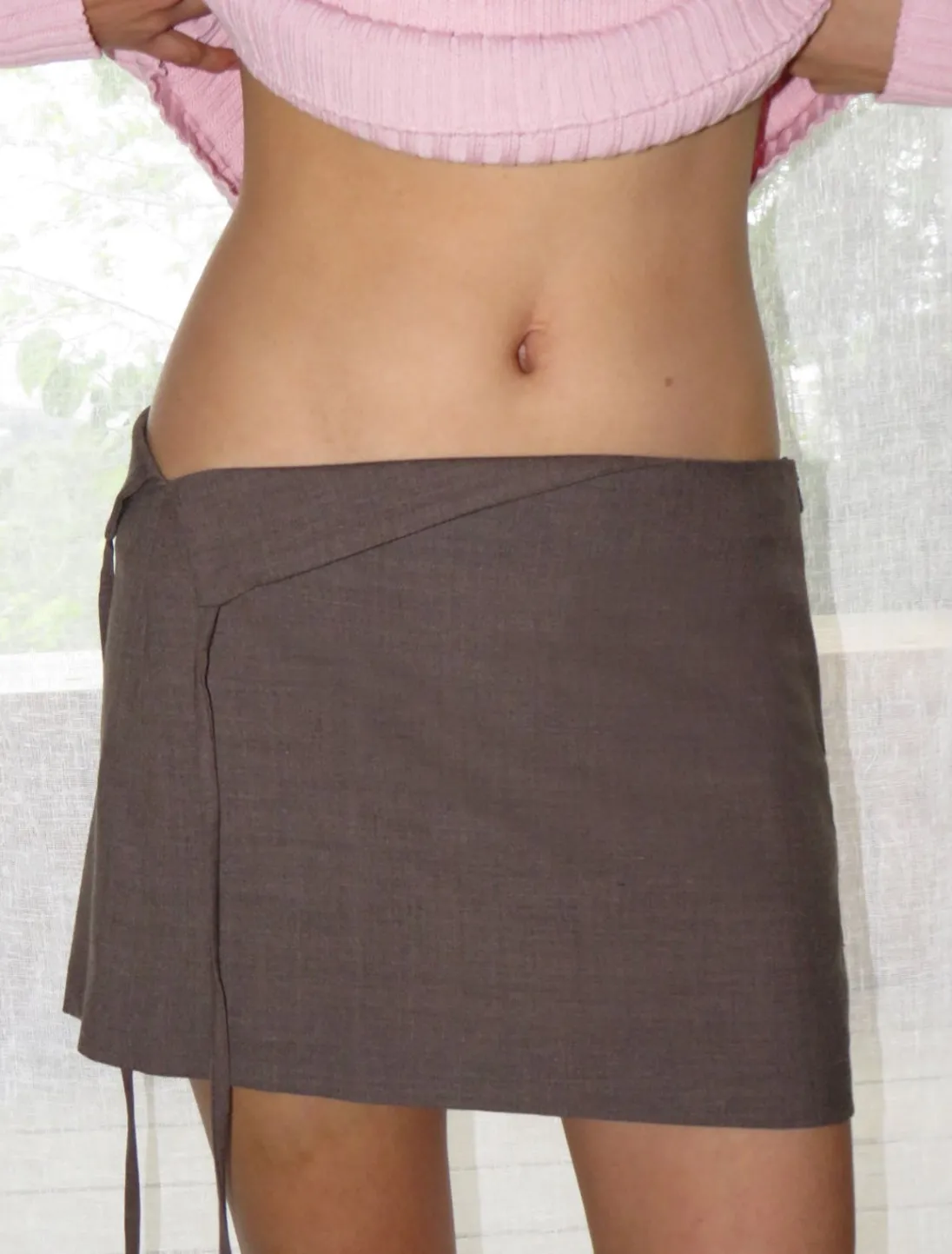 Kort Nederdel Med Foldet Stykke I Linningen Med Snor. Du Kan Bære Den Tabt Eller Binde Den.
