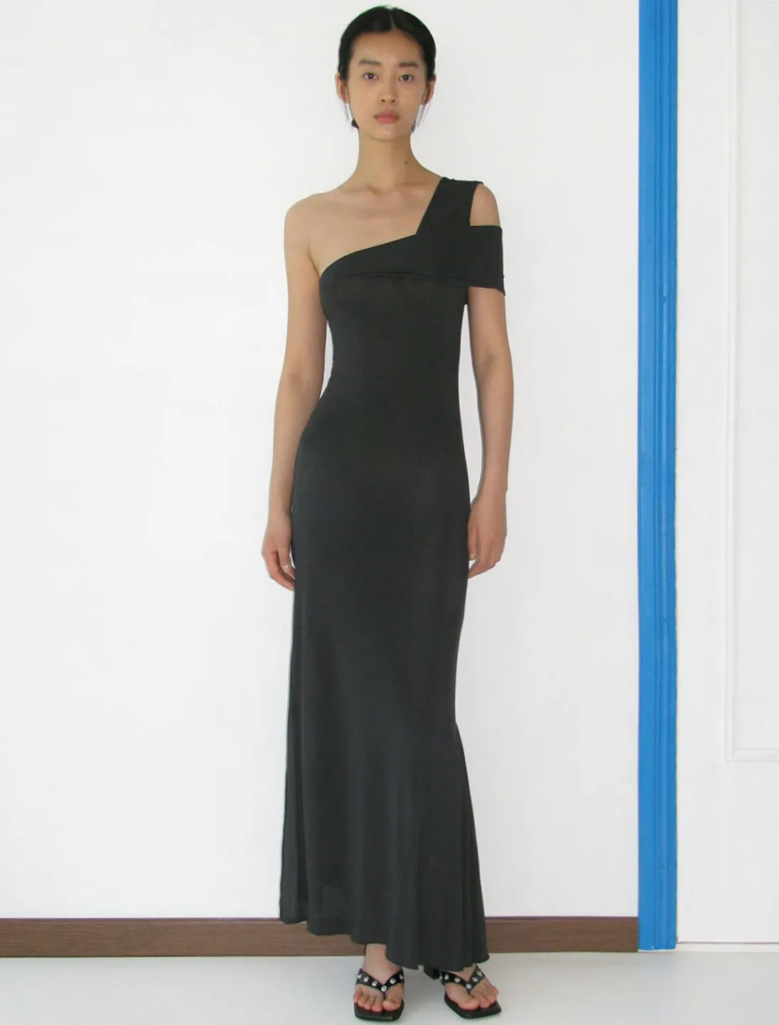 Fastsiddende, Let Gennemsigtig, Asymmetrisk Lang Kjole Med Krydsede Stropper Og Udsving.