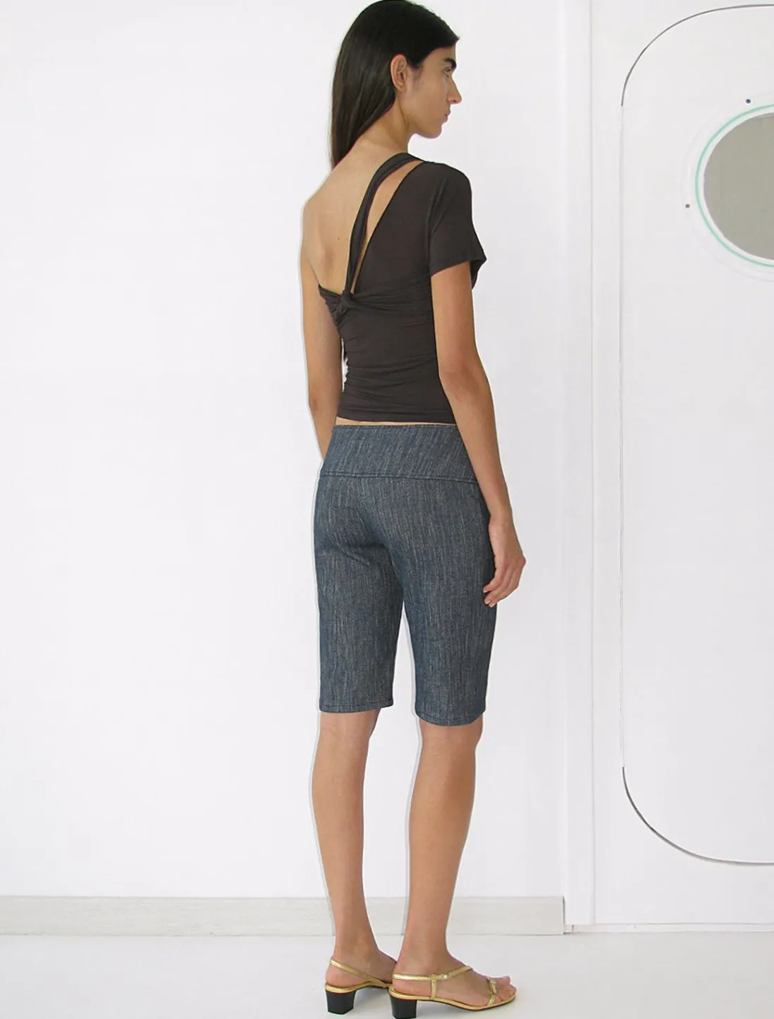 Elastisk Denimeffekt Capri-Bukser Med Bred Linning Og Lav Talje. Fastgøres Med Trykknapper.