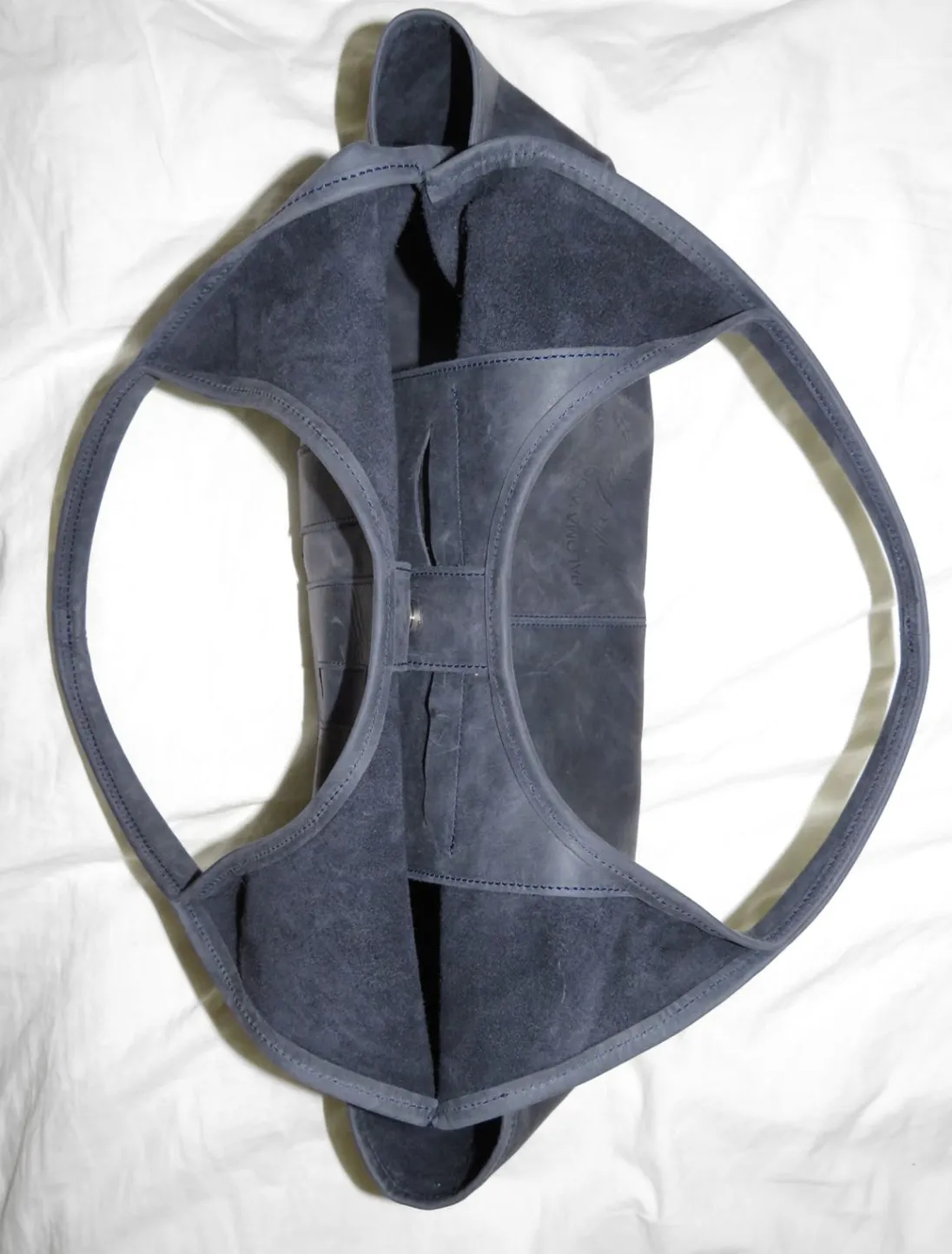 Skuldertaske Med To Lommer, Et ’10 Års’ Lædermærke På Forsiden Og Præget Tekst På Bagsiden.