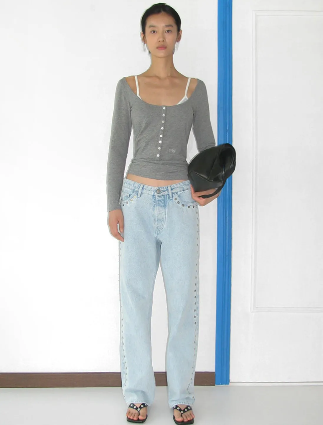 Langærmet, Tilpasset Henley-Top Med Pw-Broderi. Skalknapper I Naturlig Farve.