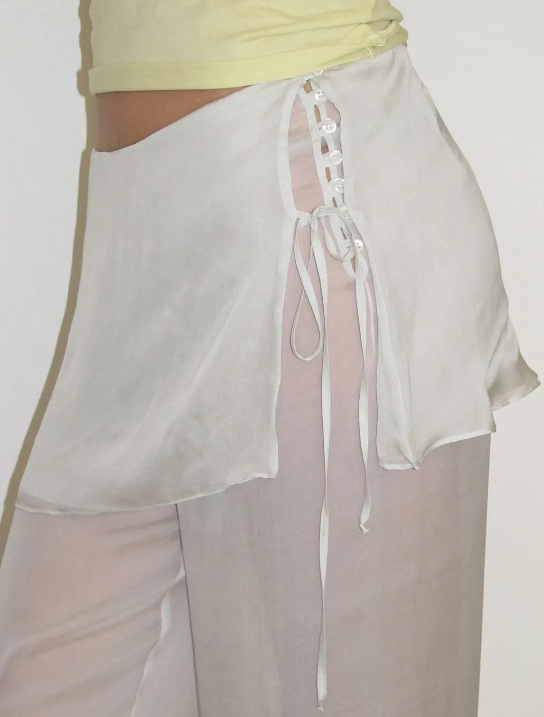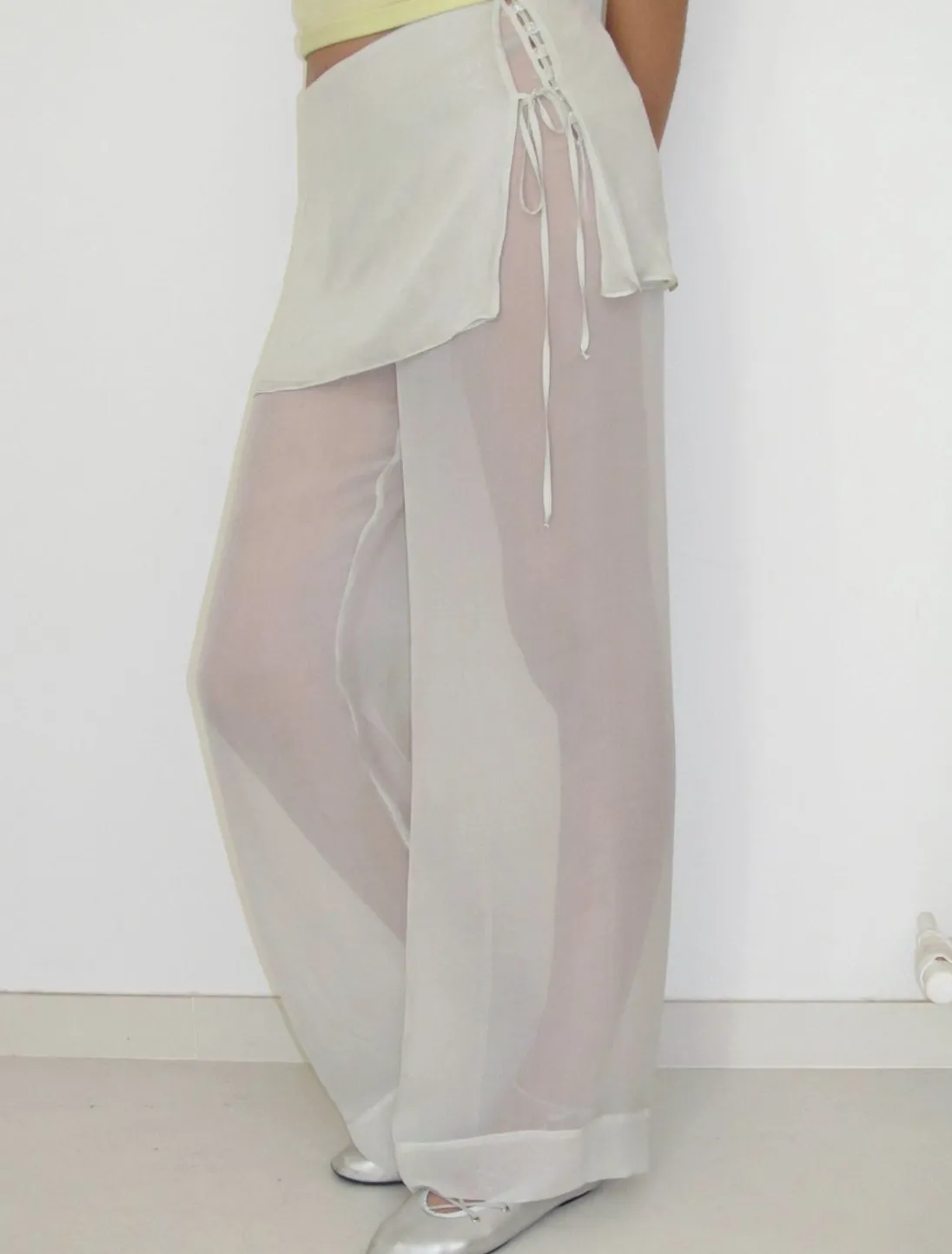 Bukser Med Brede Ben Og Mellemtaljet Med Overlappende Fast Mini-Nederdel (Kan Ikke Tages Af). Mini-Nederdelen Har Flere Lag, Så Den Er Ikke Gennemsigtig.