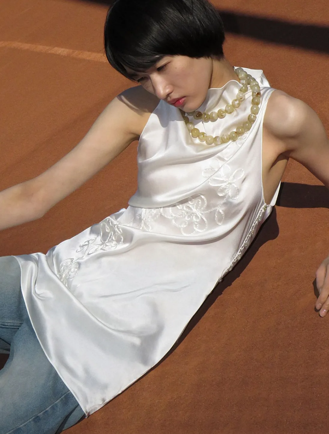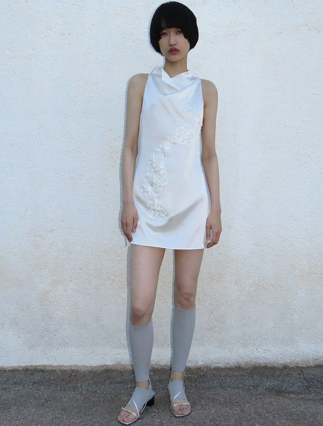Lidt Gennemsigtig, Delikat Silkekjole Med Draperet Halsudskæring. Den Har Broderi Foran Med Blomstermønstret Bånd. Den Fastgøres Med Sideknapper.